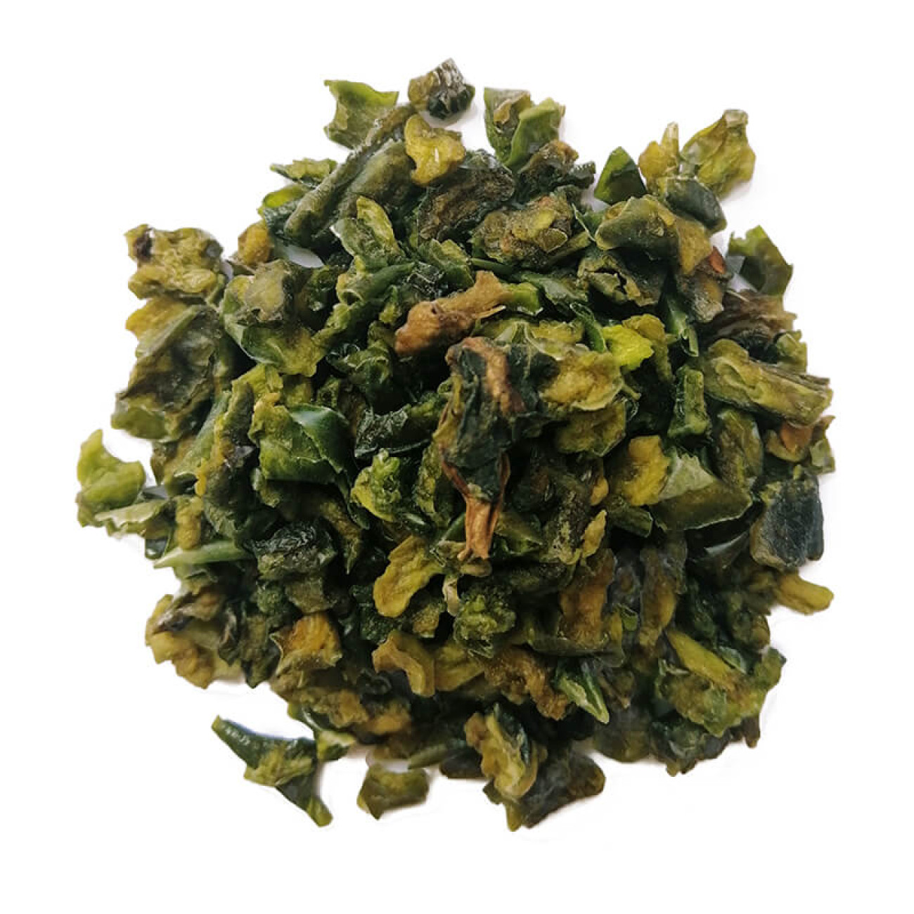 Паприка зелена різана – це висушені та подрібнені шматочки зеленої солодкої перцевої м’якоті, що зберігають свіжий, трохи трав’янистий аромат і легкий овочевий смак.